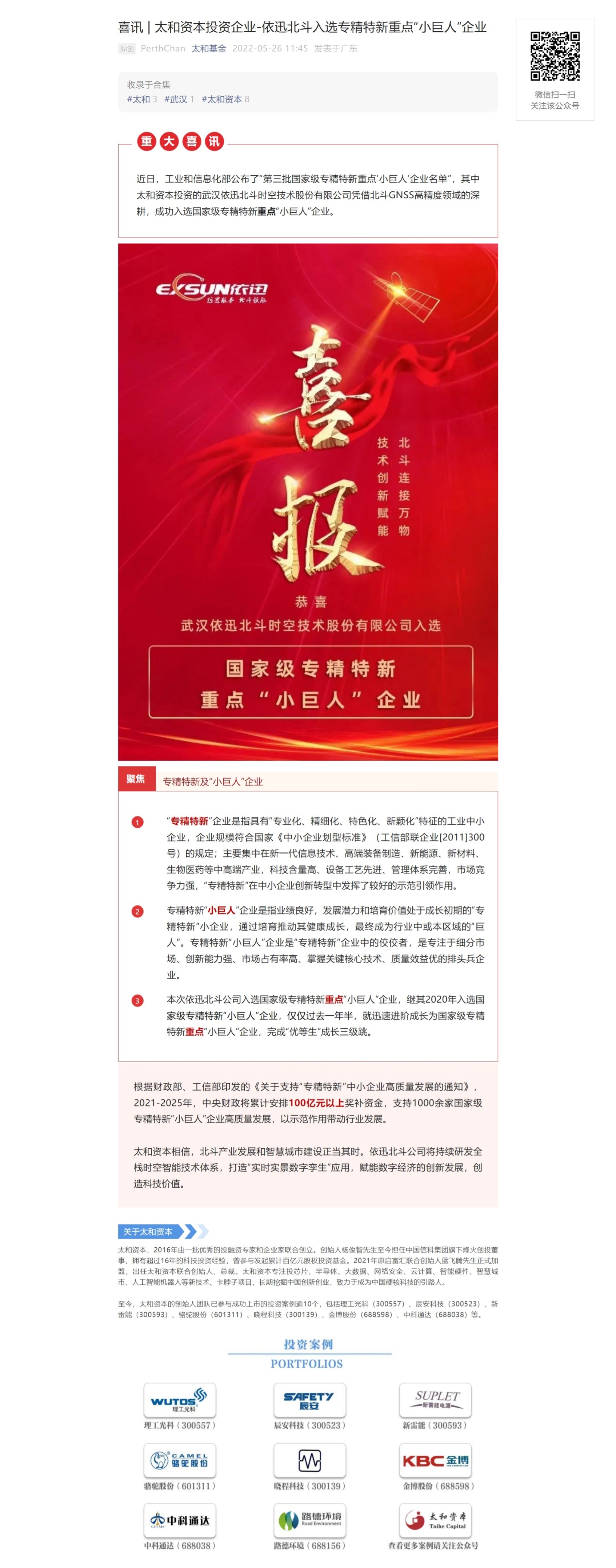喜讯 | 太和资本投资企业-依迅北斗入选专精特新重点“小巨人”企业