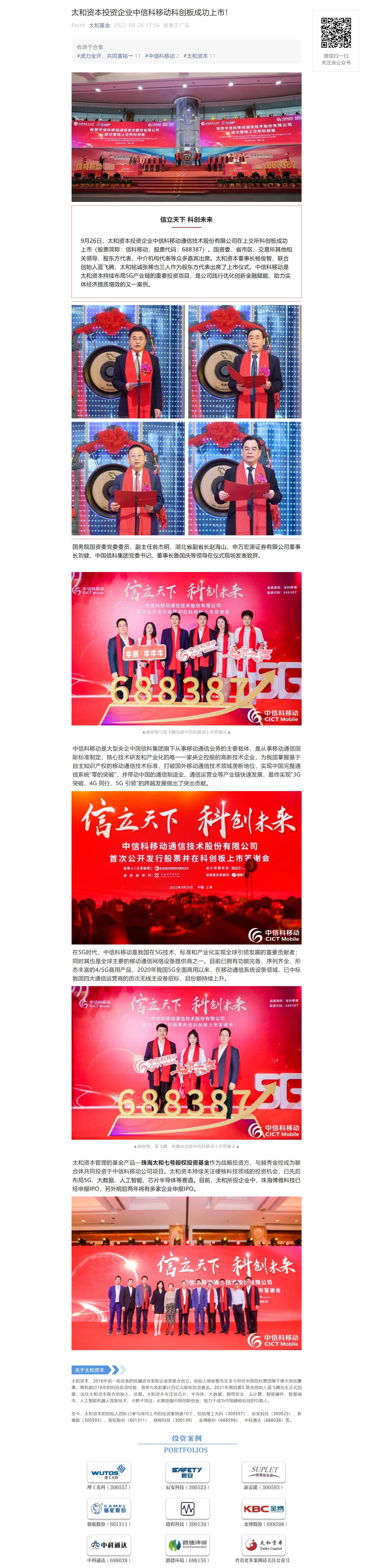 太和资本投资企业中信科移动科创板成功上市!