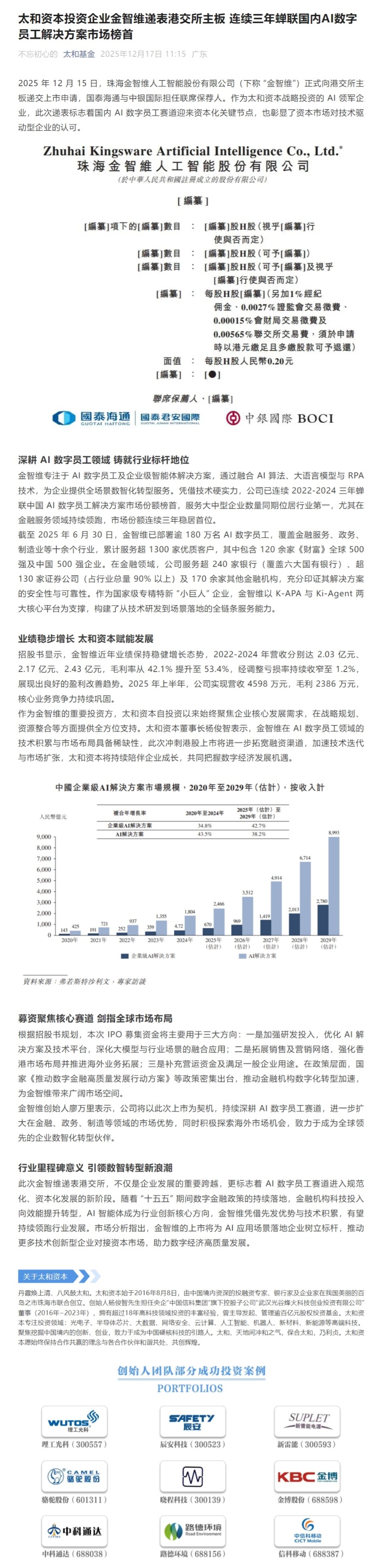 太和资本投资企业金智维递表港交所主板 连续三年蝉联国内AI数字员工解决方案市场榜首